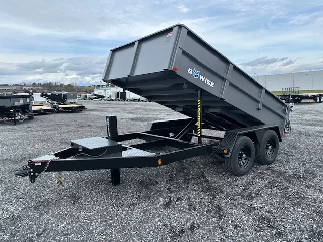 New BWISE 7×12 Low Profile Dump Trailer (Model DUL12-15) for contractors and homeowners seeking maximum maneuverability. This compact, yet powerful 12-foot dump trailer features a 14,900 lbs GVWR and dual 7,000 lb axles, handling substantial debris and equipment. Its Low Profile design ensures easier loading and lower center of gravity. Essential features include a Hydraulic Jack for effortless hookup, a Scissor Lift, and a versatile Combo Gate.