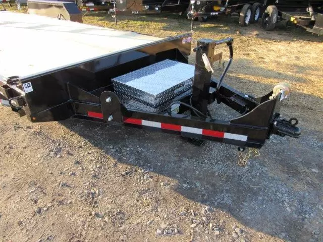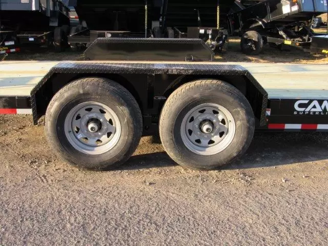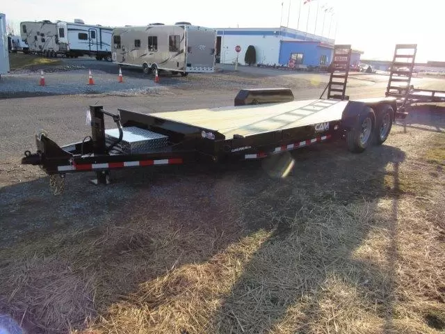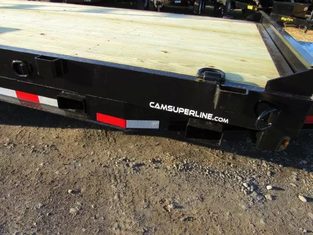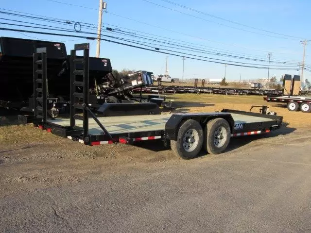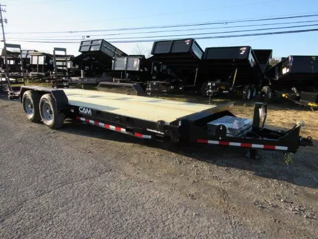 New CAM Superline 7×20 Equipment Trailer (14,000 lbs GVWR est.) designed for safe and efficient machinery transport. This heavy-duty, 20-foot tandem axle trailer features an integrated Pallet Fork Carrier for secure attachment storage and robust ramps for easy loading. Built with durable dual 7,000 lb axles and a reinforced steel deck.