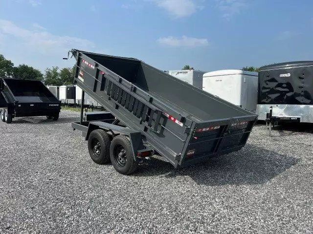 New Covered Wagon 6×12 Prospector Dump Trailer (7,000 lbs GVWR est.), perfectly sized for maneuverability and professional capacity. This 12-foot dump trailer features a powerful hydraulic lift system and essential, integrated Ladder Ramps for loading mowers, ATVs, or small equipment. It is the dependable choice for residential projects and small landscaping businesses.